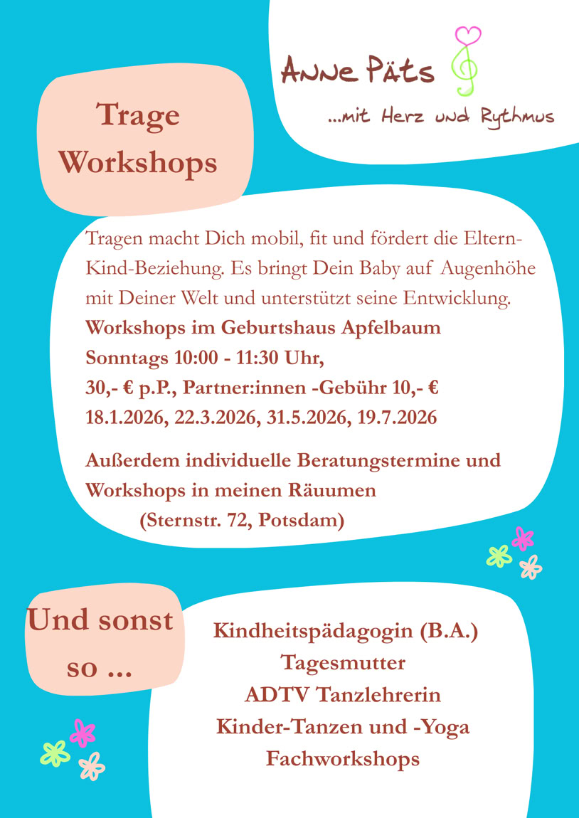 Leben, Wärme und Bewegung. In der täglichen Betreuung von Kindern als Tagesmutter, bei den Familiennachmittagen, in meinen Workshops für Fachpersonal, beim Tanzen und beim Tragen von Babys. Und nun: Viel Spaß! Eure Anne